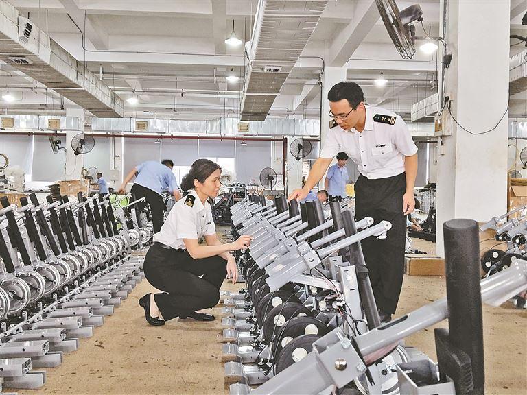 厦门海关工作人员深入我市体育用品出口企业,了解企业出口情况。(童婕 摄)