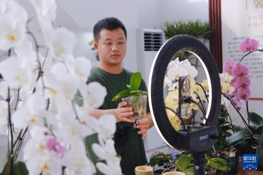 8月9日,电商在龙岩市永定区龙潭镇蝴蝶兰基地直播带货。新华社记者 陈为 摄