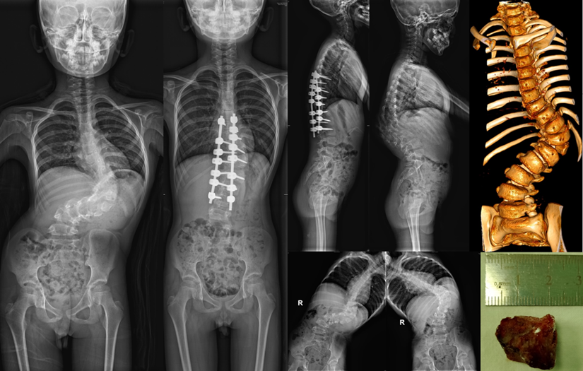 徐杨团队根据检查影像作了详实的分析和评估,决定将患者的T12半椎体切除,以较短节段固定进行畸形矫正。术后早期效果良好,患者身高由术前的1.29米纠正到术后的1.37米,剃刀背畸形得到明显纠正。“孩子手术后还需要持续佩戴支具和严密随访观察,等骨骼发育接近成熟的时候再次进行最终的融合手术。”徐杨说。