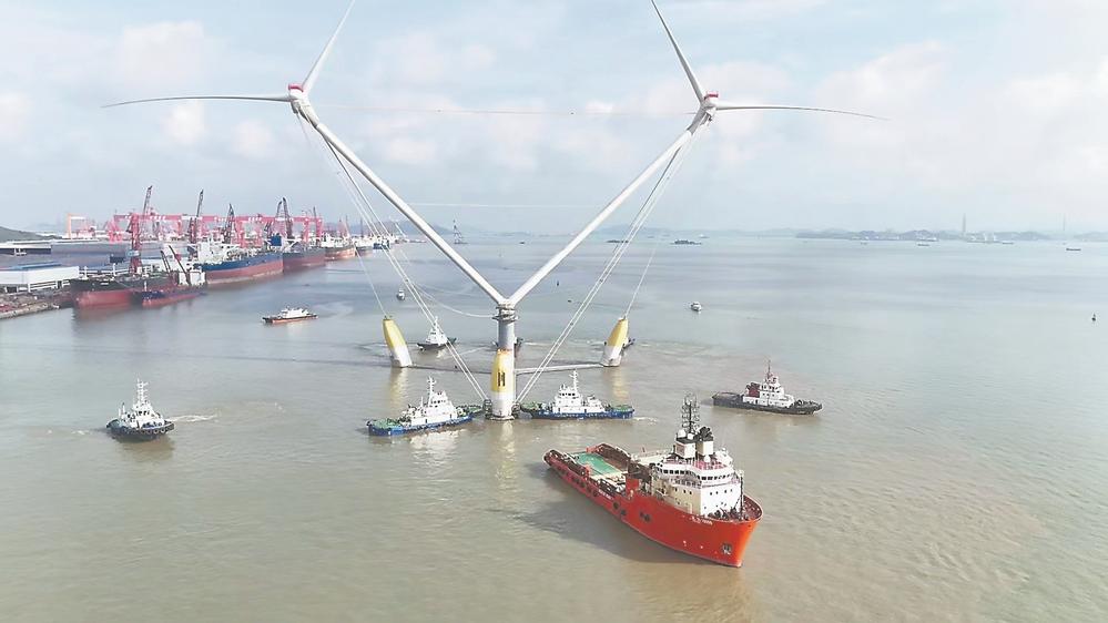 “明阳天成号”总装机容量16.6兆瓦,由两套8.3兆瓦的风电机组以“V”字形排列组合而成。该平台投用后,可应用于水深35米以上的全球广泛海域,平均每年可发电约5400万千瓦时,能满足3万户三口之家一年的日常用电。