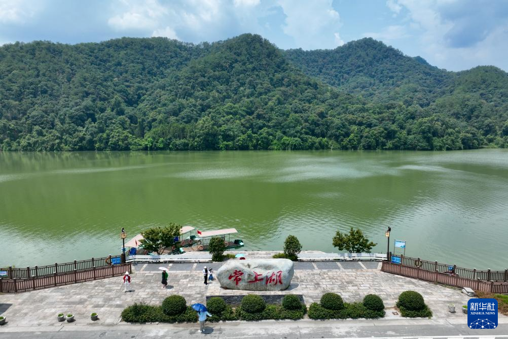 8月10日,游客在福建省三明市将乐县常口村常上湖畔游玩(无人机照片)。新华社记者 姜克红 摄