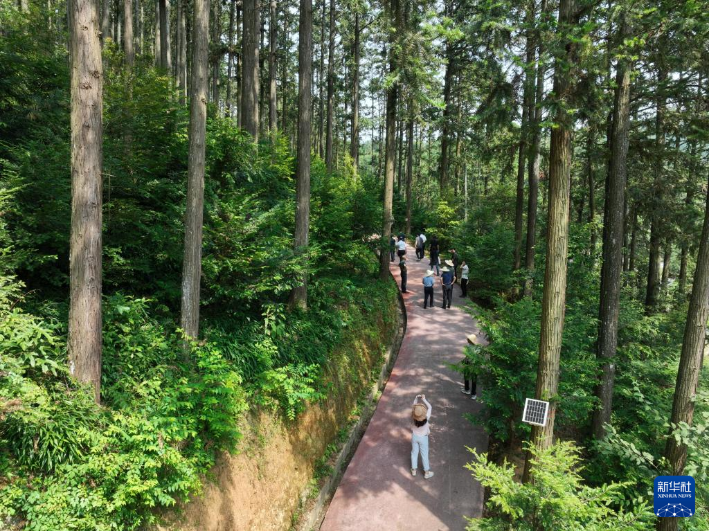 8月10日,参观者前往福建三明沙县官庄国有林场参观(无人机照片)。新华社记者 姜克红 摄