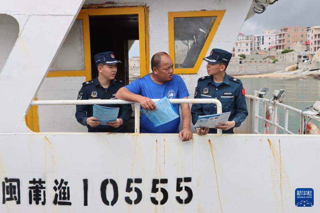 8月16日上午,莆田海警局秀屿工作站工作人员在渔船上开展普法宣传。(受访者供图)