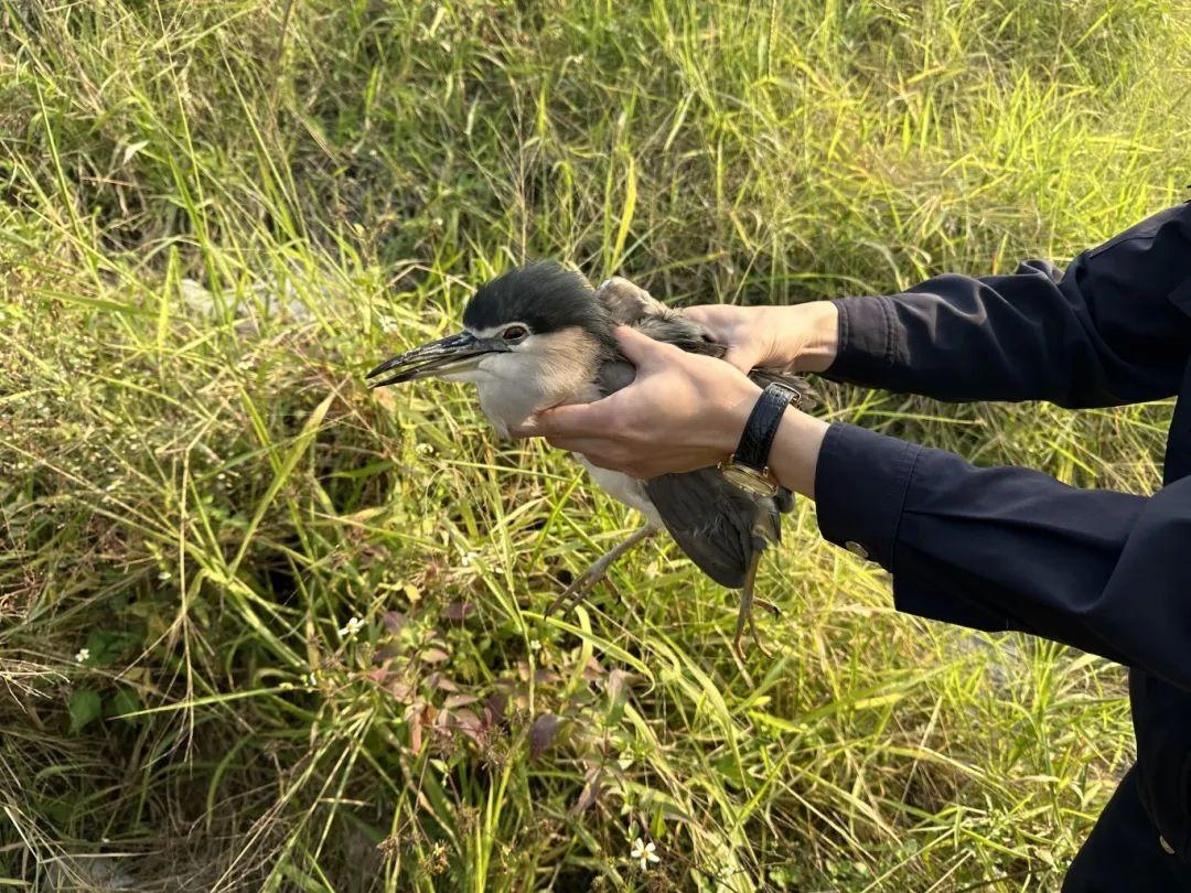 经辨认,该鸟为国家二级重点保护动物夜鹭,为成年体,其体表未见受伤。民警喂食后,联合野生动物保护站工作人员将夜鹭在水草丰盛地区内放生。