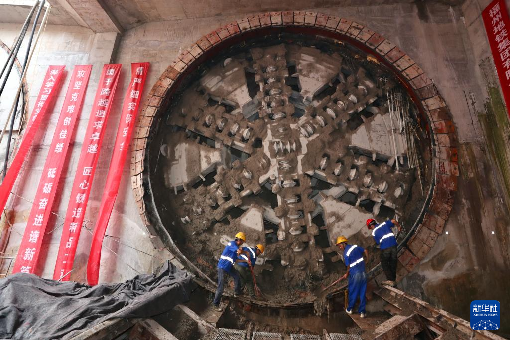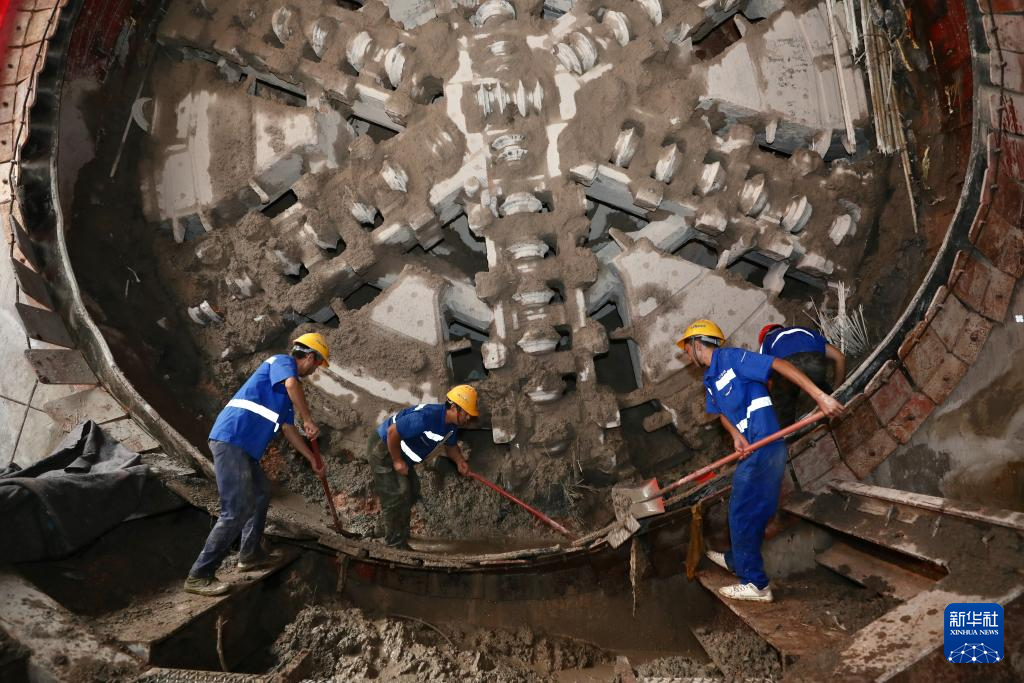 8月21日,中铁上海局城建分公司工人在清理福州滨海快线福州火车站至东门站区间右线盾构机刀盘。新华社记者 姜克红 摄