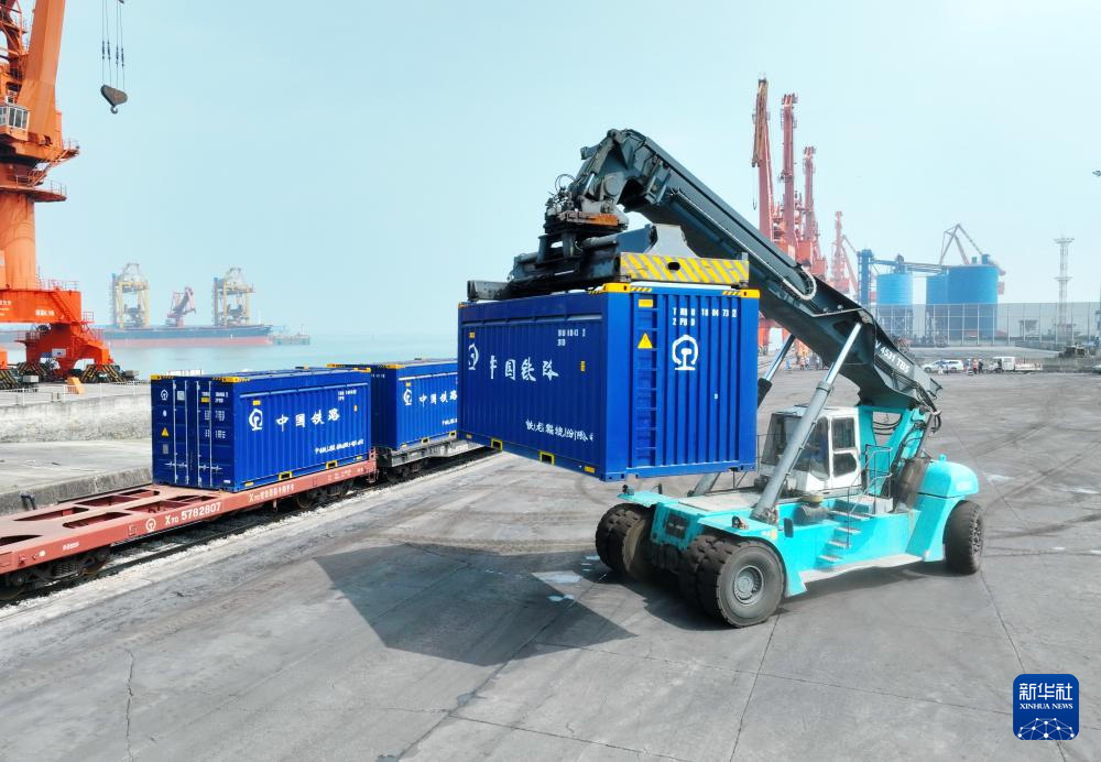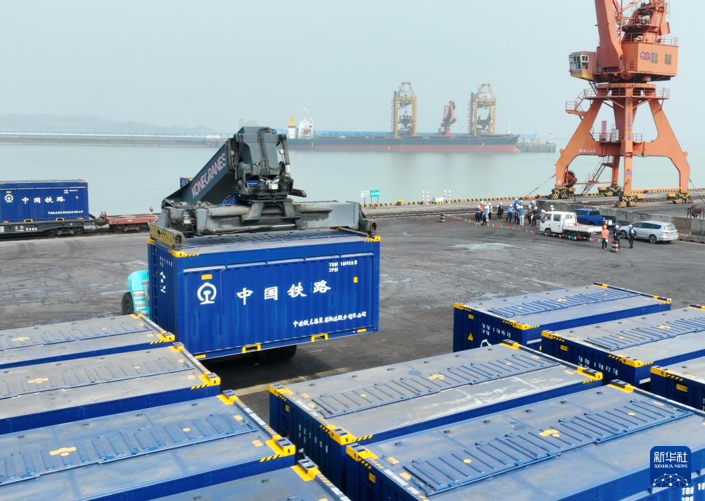 8月24日,在位于泉州市泉港区的肖厝港区沙格码头,作业人员将装载豆粕的新型通风集装箱吊上平板车(无人机照片)。新华社记者 林善传 摄