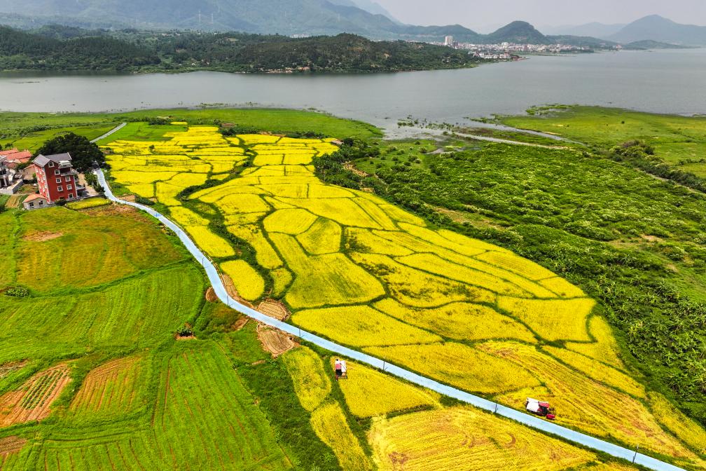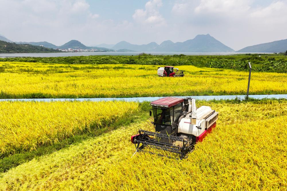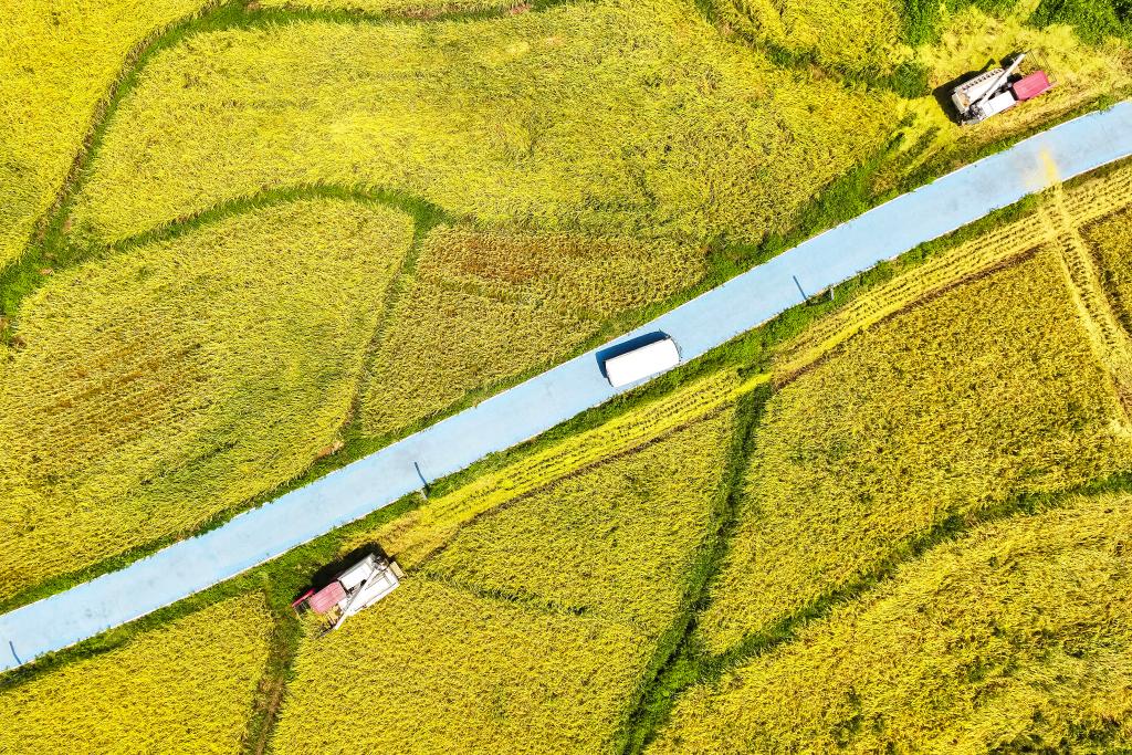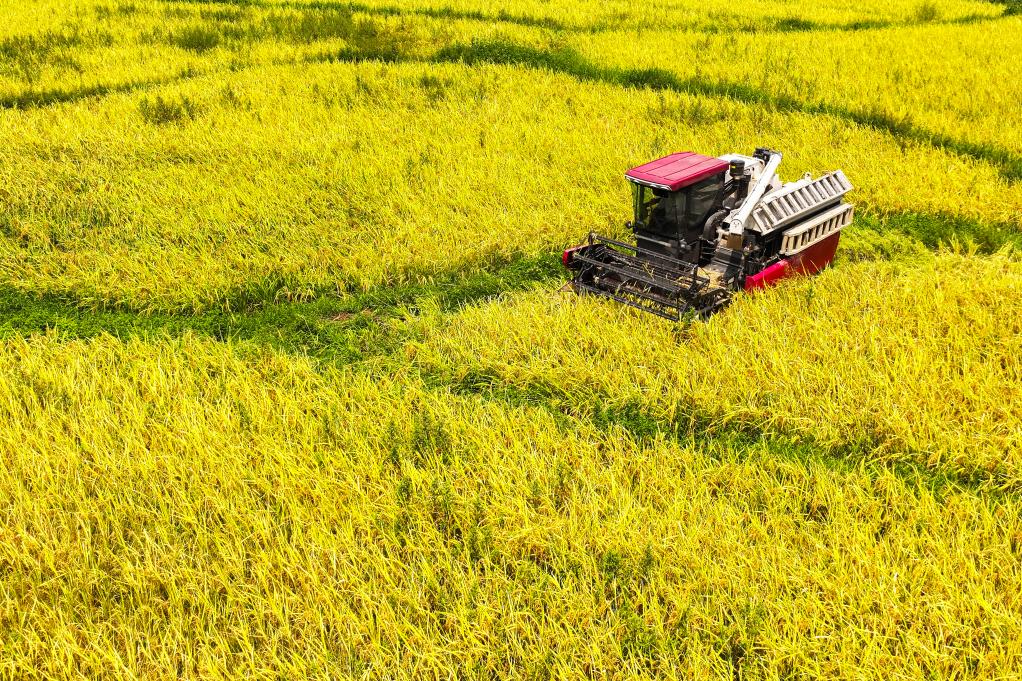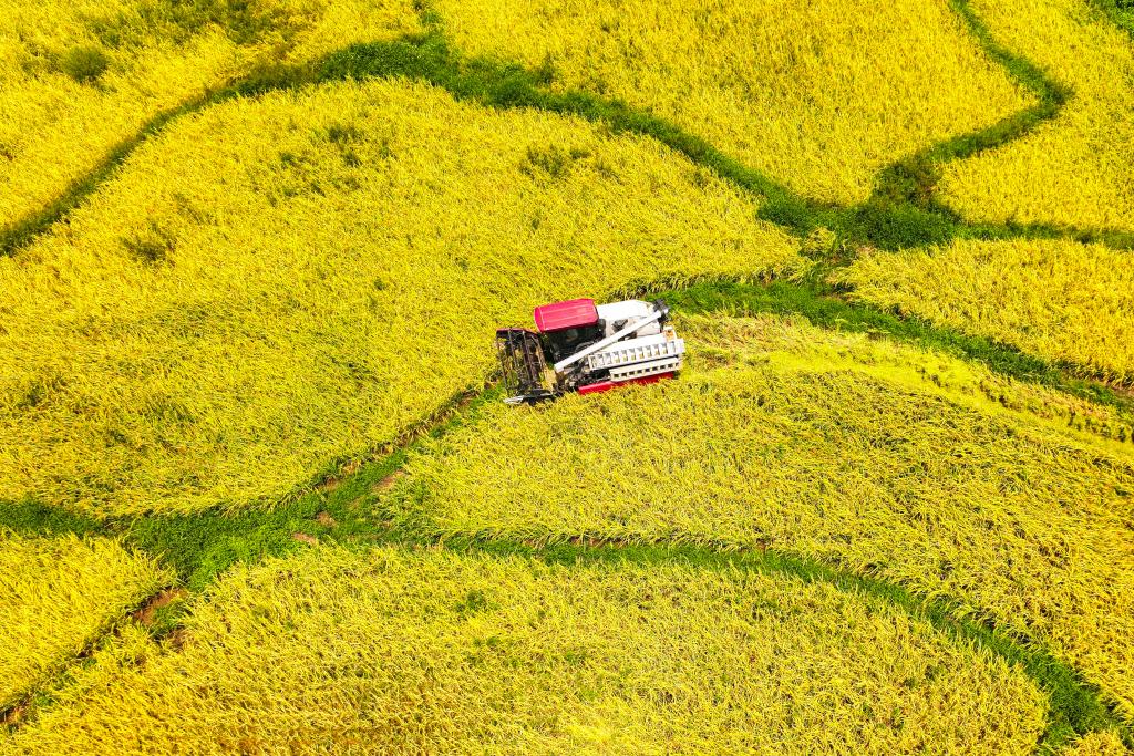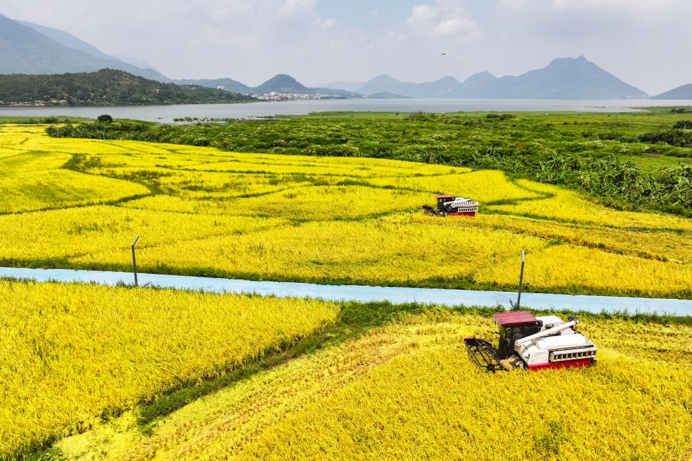 以上图片:2024年8月24日,福建省福清市东张水库水源保护区内的无施肥试验田里,农户驾驶机械化收割机开展水稻收割作业(无人机照片)。CICPHOTO/谢贵明 摄