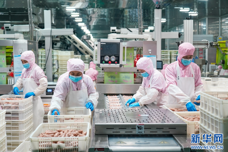 图为中印尼“两国双园”内的福建御冠食品有限公司车间里,工人在包装烤肠(资料图)。新华网 蒋巧玲 摄