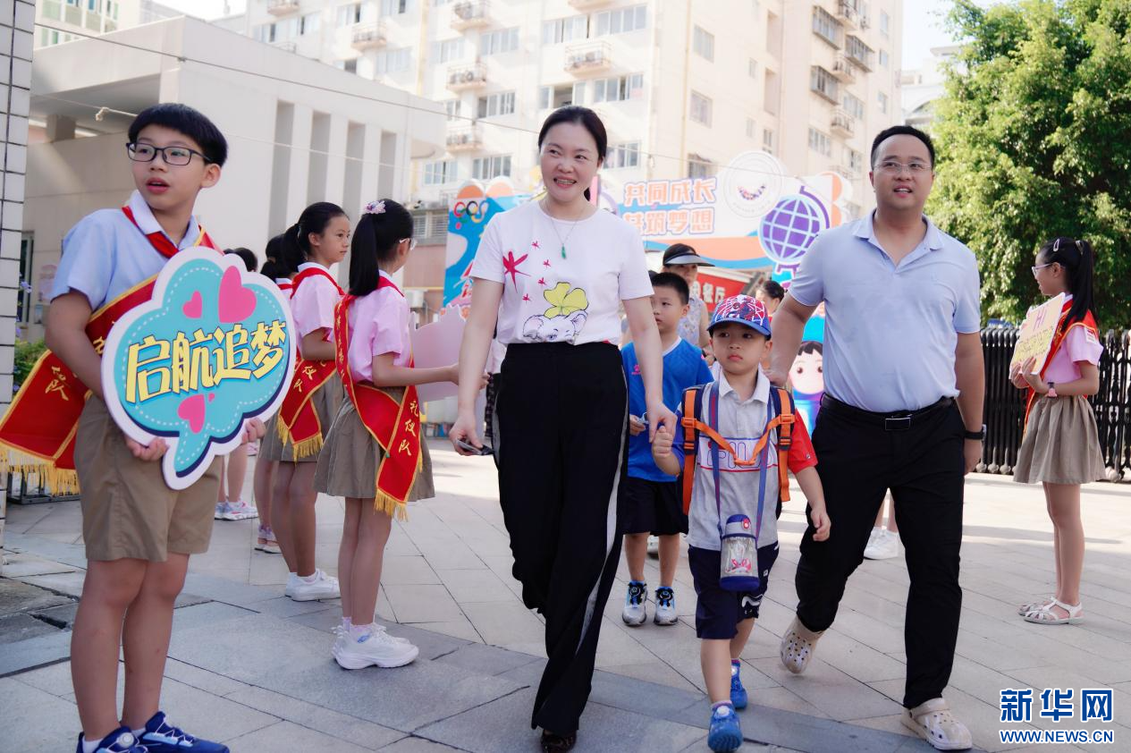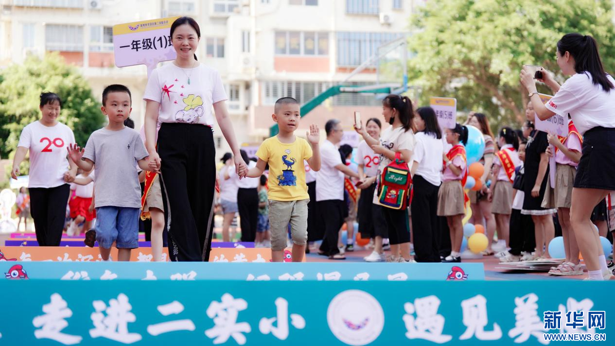 泉州市丰泽区第二实验小学一年级新生穿过“启智门”,开启全新的学习生活。新华网发(林楷煜 摄)