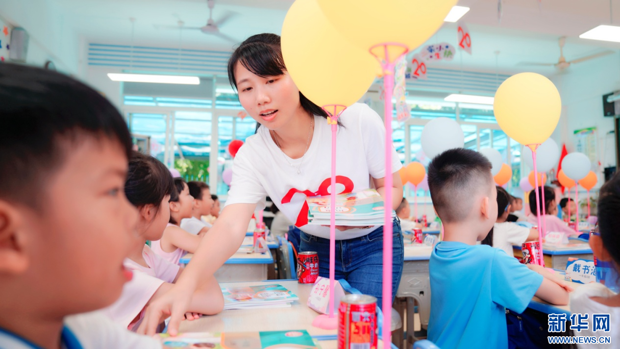 泉州市丰泽区第二实验小学老师为一年级新生发放新书。新华网发(林楷煜 摄)