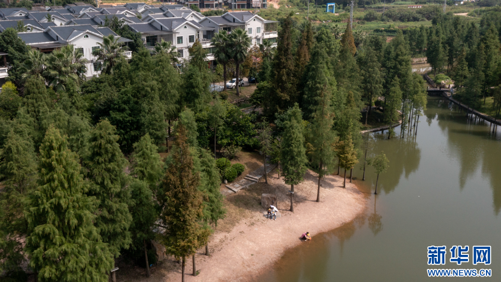 三明市三元区小蕉村镜湖及周边水杉林,如今已成为网红打卡点(9月1日摄,无人机照片)。新华网 肖和勇 摄