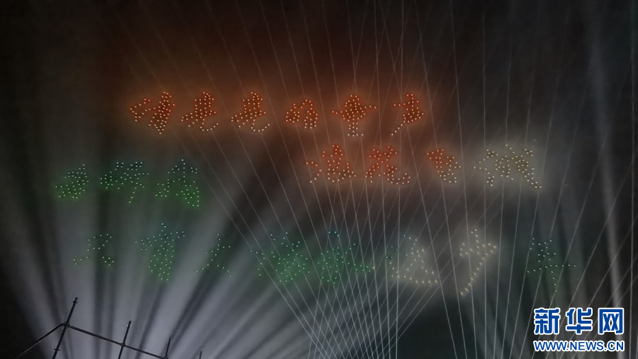 无人机在夜幕中组成文字,把诗歌写在海天之间。新华网 刘丰 摄