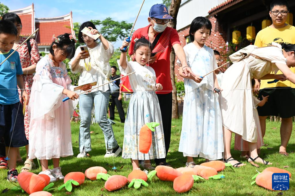 在莆田市举办的中秋游园会上,家长带领孩子们参加“玉兔垂钓”游戏。新华社发
