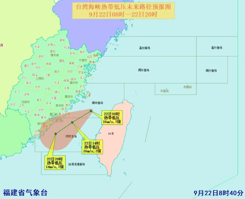 此外,22日8时,热带低压在台湾海峡海面上生成。11时,热带低压中心位于福建晋江偏东方向约95公里的海面上,中心附近最大风力7级(15米/秒)。未来它将以每小时10~15公里的速度向西偏南方向移动。
