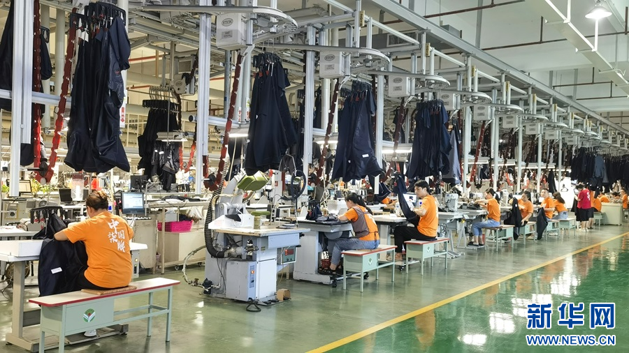 柒牌生产车间里,工人正按生产流程缝制西服。 新华网 刘丰 摄