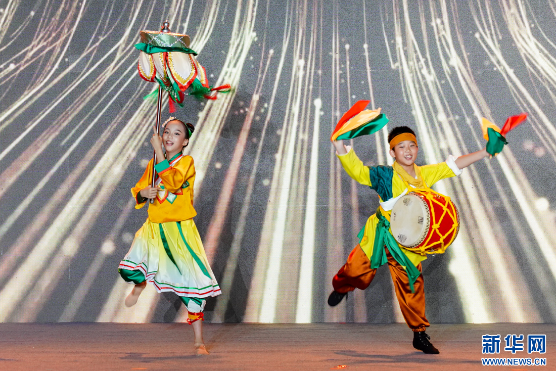 9月27日晚,小朋友们踩高跷登台表演节目。新华网 肖和勇 摄