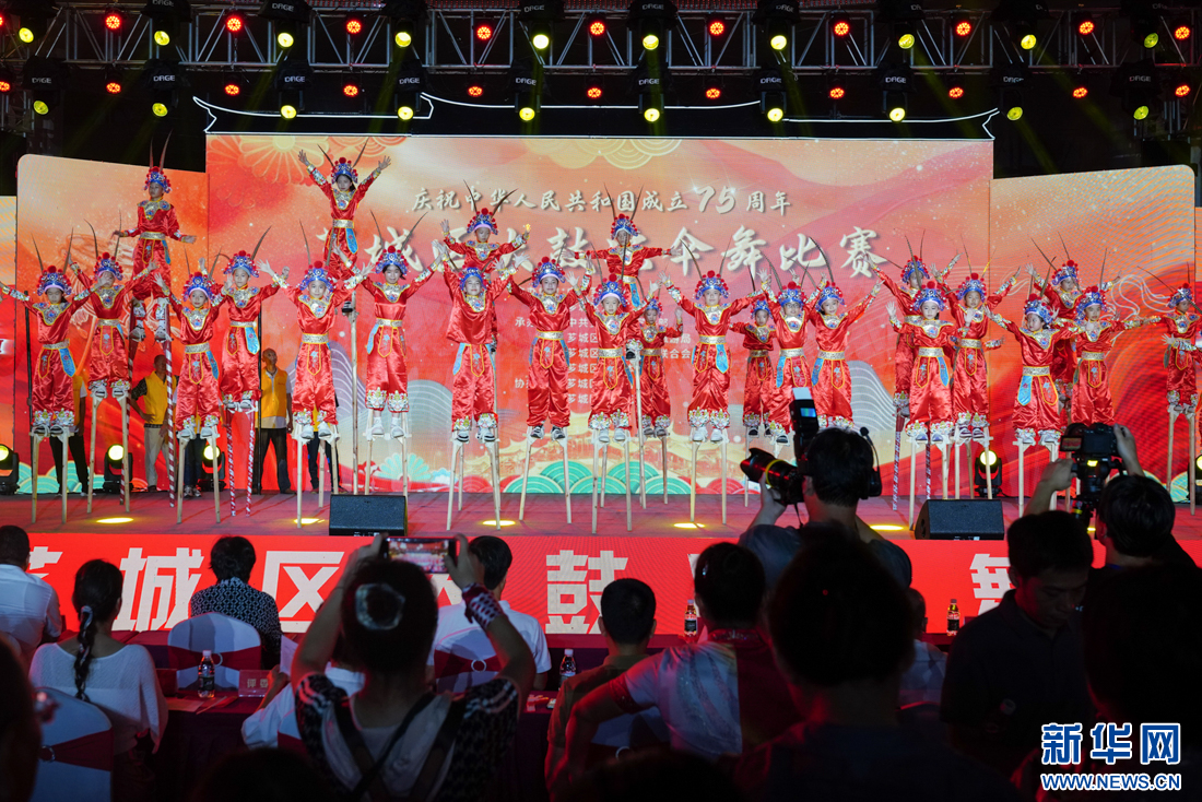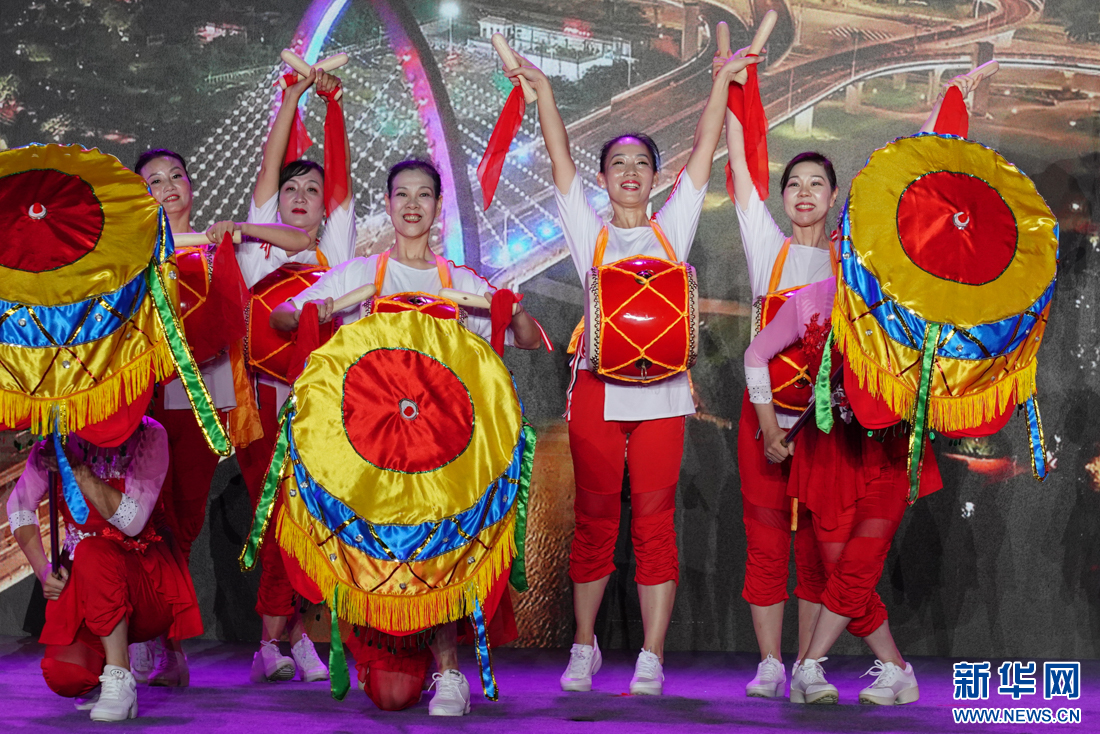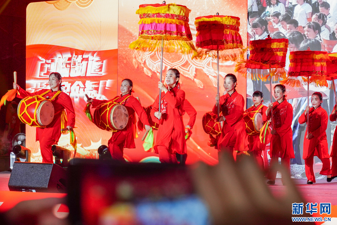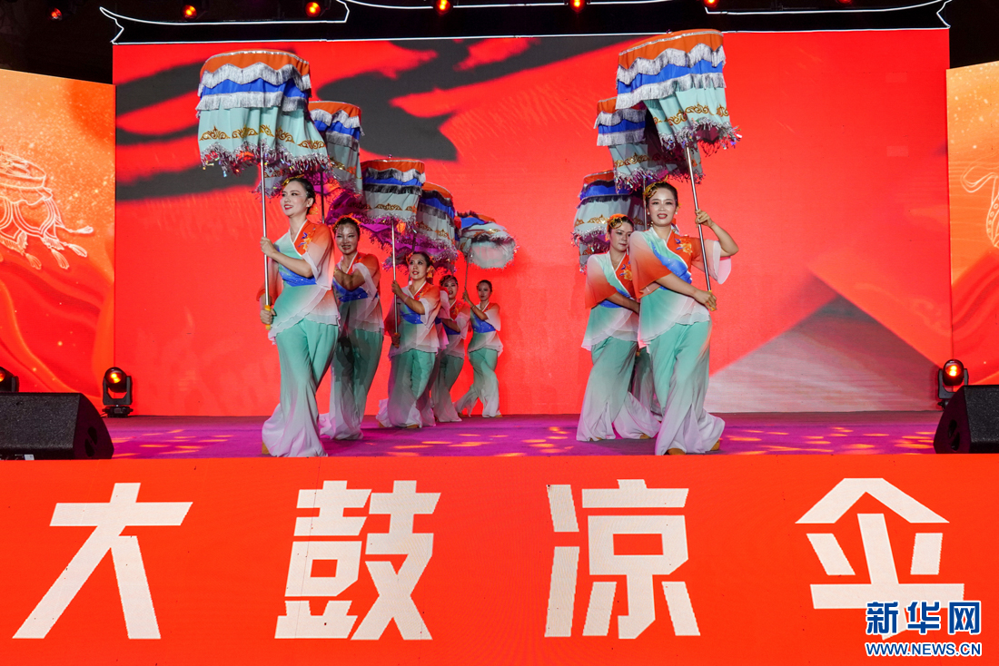 9月27日晚,来自乡镇、街道的大鼓凉伞舞表演队在表演节目。新华网 肖和勇 摄