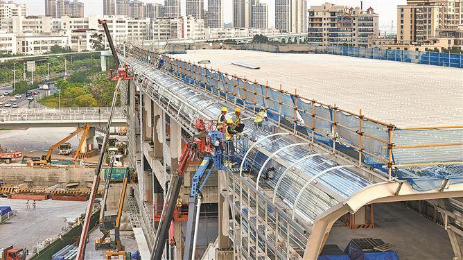 地铁4号线是我市首条采用全自动运行的地铁快线,起自软三东站,终至翔安机场站,全长45公里,设置车站12座。图为地铁4号线官浔站(在建)。