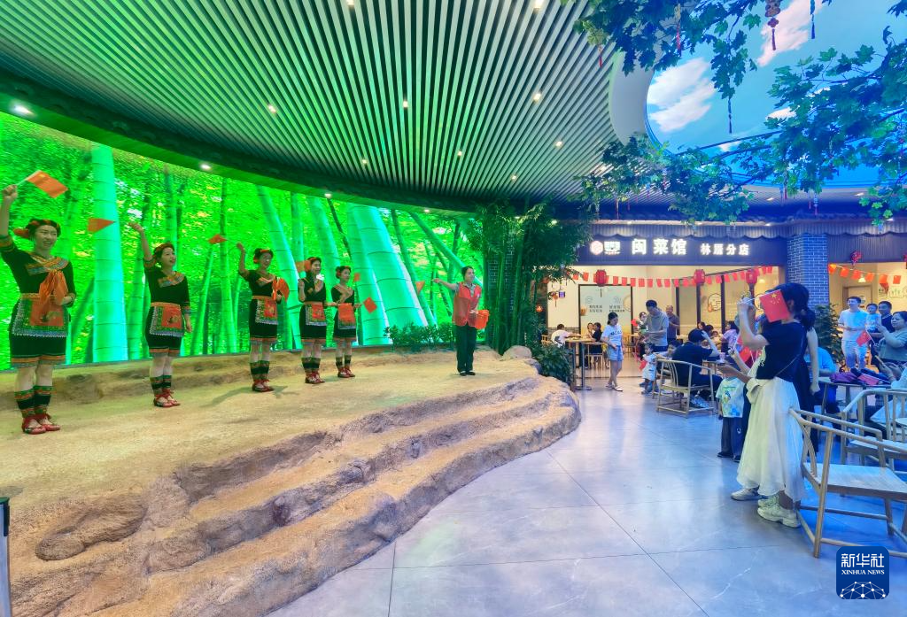 “林厝服务区临近猴盾村、半月村等多个畲民聚居的民族村寨,因此我们打造了沉浸式民族风情主题服务区,不仅展示畲族传统文化元素,还有乌米饭、菅叶粽、糍粑等畲族特色小吃,让游客在‘快进慢游’中,深刻体验民族特色文化和地域风土人情。”林厝服务区主任陈青说。