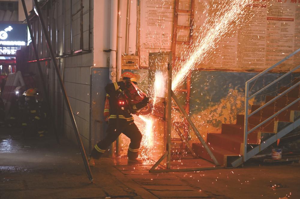 9月29日晚,平潭综合实验区在车站夜市开展人员密集场所灭火救援演练,消防救援人员正在使用金属切割机破拆防盗门。(郭雅莹 薛晶晶)