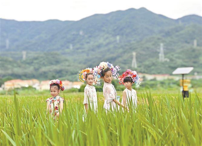 国庆假期,集美田头村举办“育见山海”美育主题活动,图为小朋友体验簪花,感受传统文化魅力和乡村田园风光。(供图/田头村)