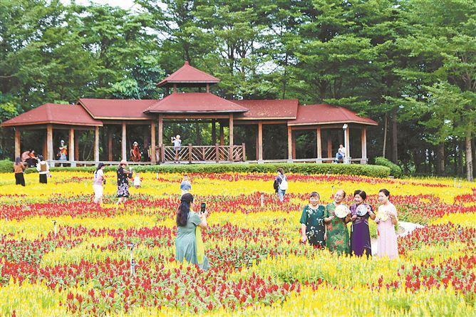 园博苑海洋岛6500平方米的凤尾鸡冠花绽放,吸引市民游客拍照打卡。(记者 吴海奎 摄)