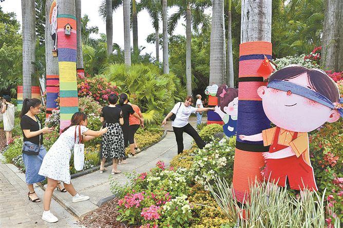 花境广泛运用了新品种、新技术和新材料,三角梅、鹤望兰、枫叶天竺葵等按照色彩、高度、花期搭配在一起,主题鲜明,设计理念新颖。图为儿童主题花境。(记者 张江毅 摄)