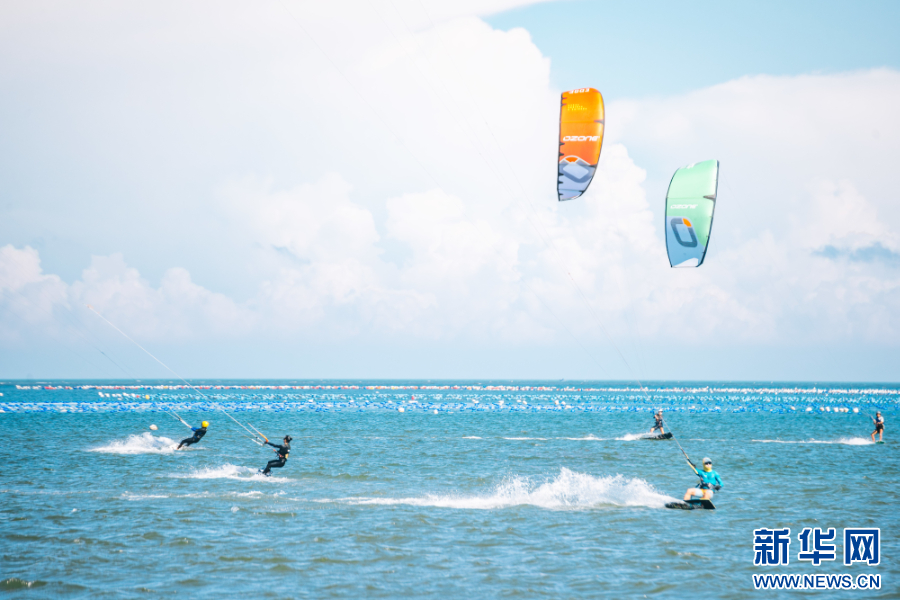 平潭凭借优质的海岛资源,连续七年获评“全国十佳体育旅游目的地”。图为风筝冲浪好手在海上感受运动的乐趣。 新华网发(陈澜清 摄)