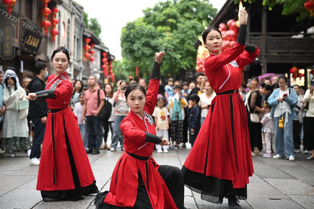 在福州三坊七巷中进行的一场快闪活动上,演员抽簪作刀而舞。新华社记者 林善传 摄