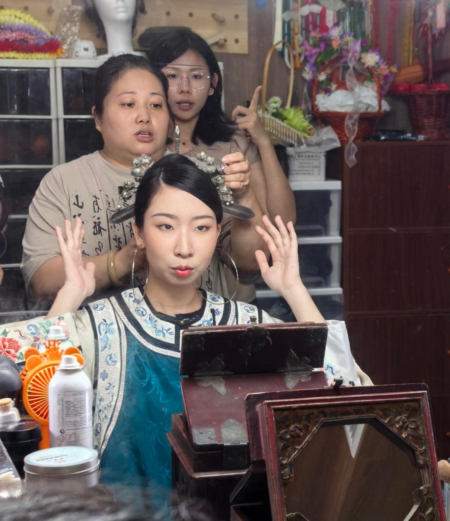 黄秋辉(中)正为客人整理头上的三条簪。(受访者供图)