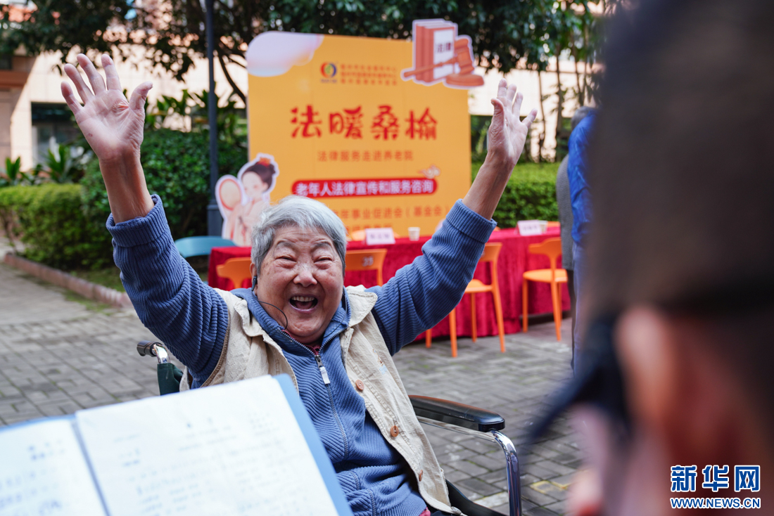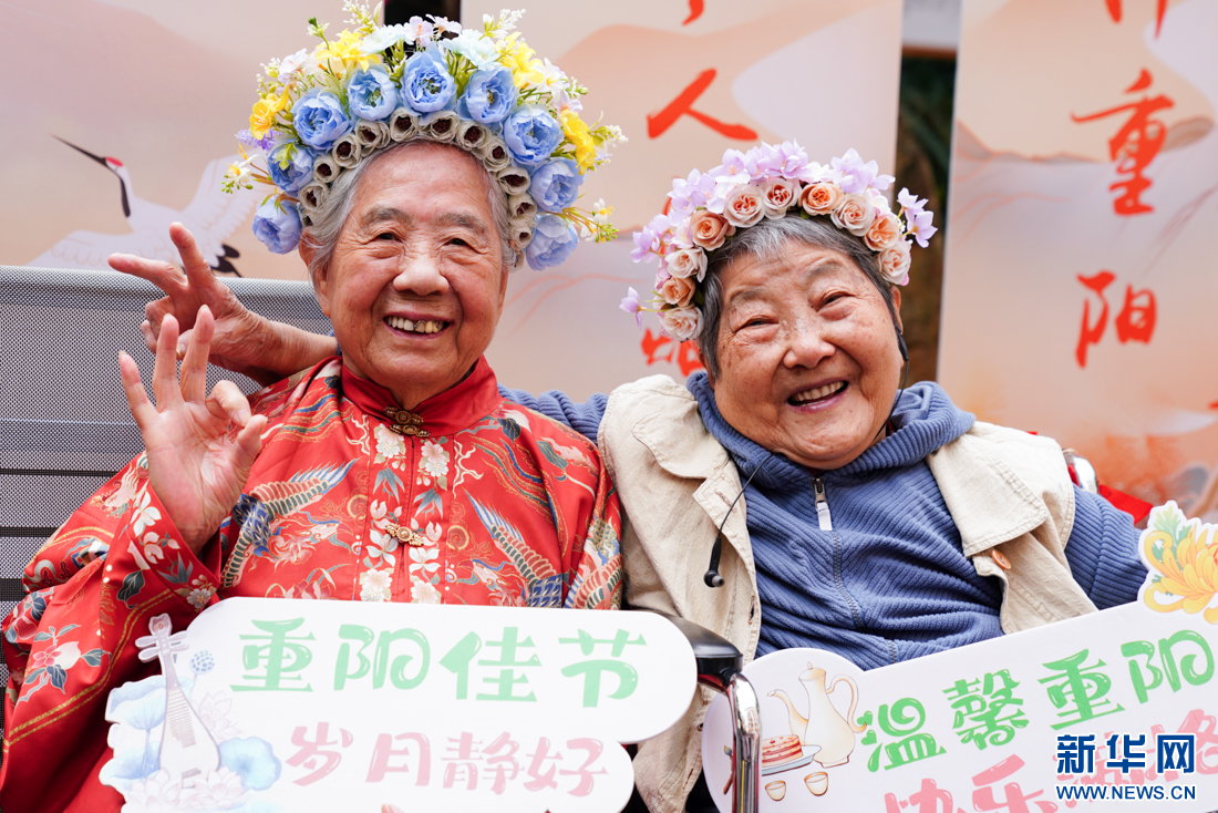 新华网福州10月11日电(肖和勇)方才还在“指挥”乐队演奏歌曲,转眼就戴上了时尚花围,拉着老友一起拍照,欢喜溢满脸庞。这个重阳节,福州市国德老年康养中心,93岁老人刘亚民笑逐颜开。