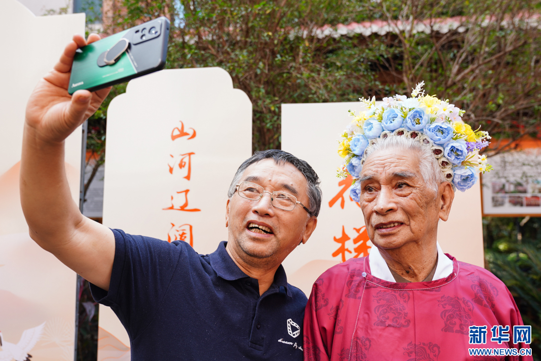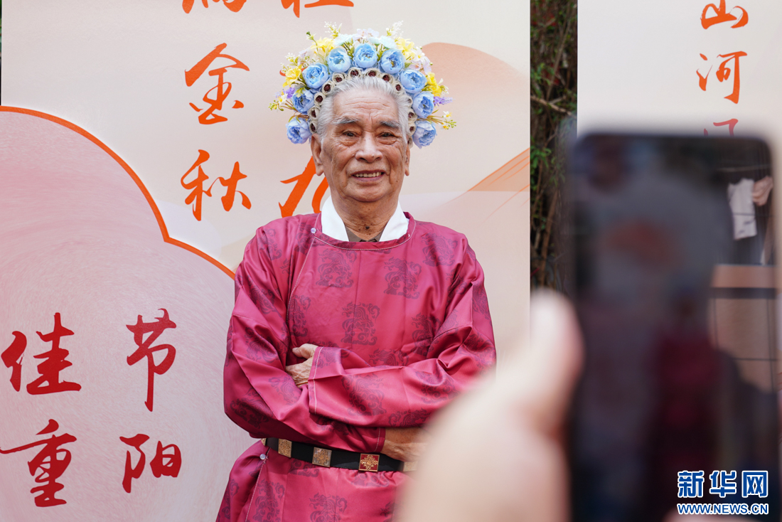 10月11日,90岁老人许圣时穿上大红汉服,戴上时尚花围,让现场摄影师拍照留念。新华网 肖和勇 摄
