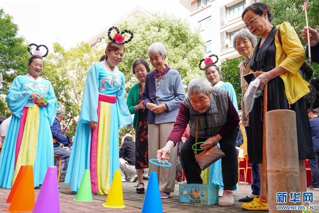 10月11日,老人们在体验套圈游戏。新华网 肖和勇 摄