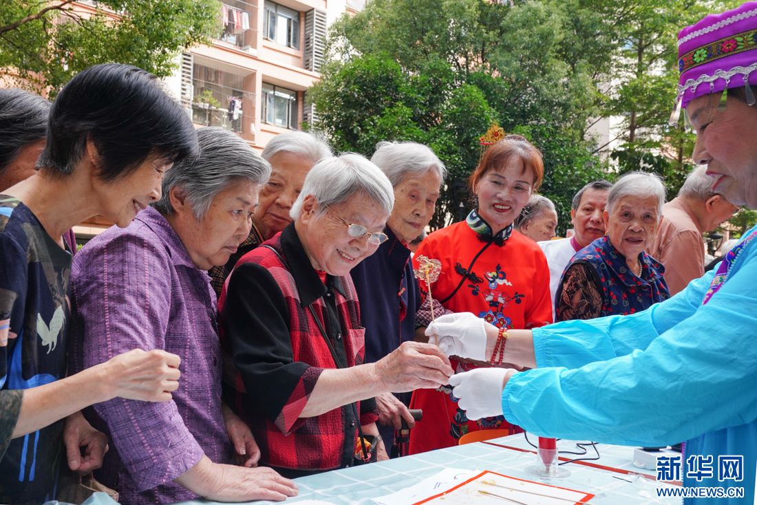 10月11日,老人们在欣赏糖画制作技艺。新华网 肖和勇 摄