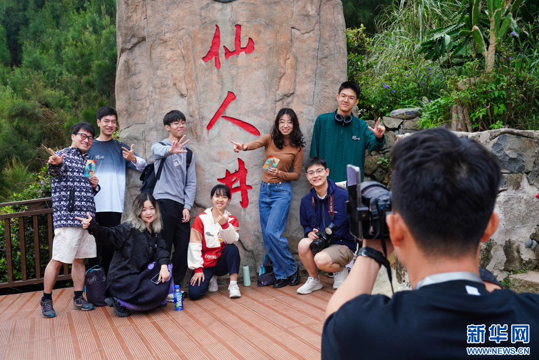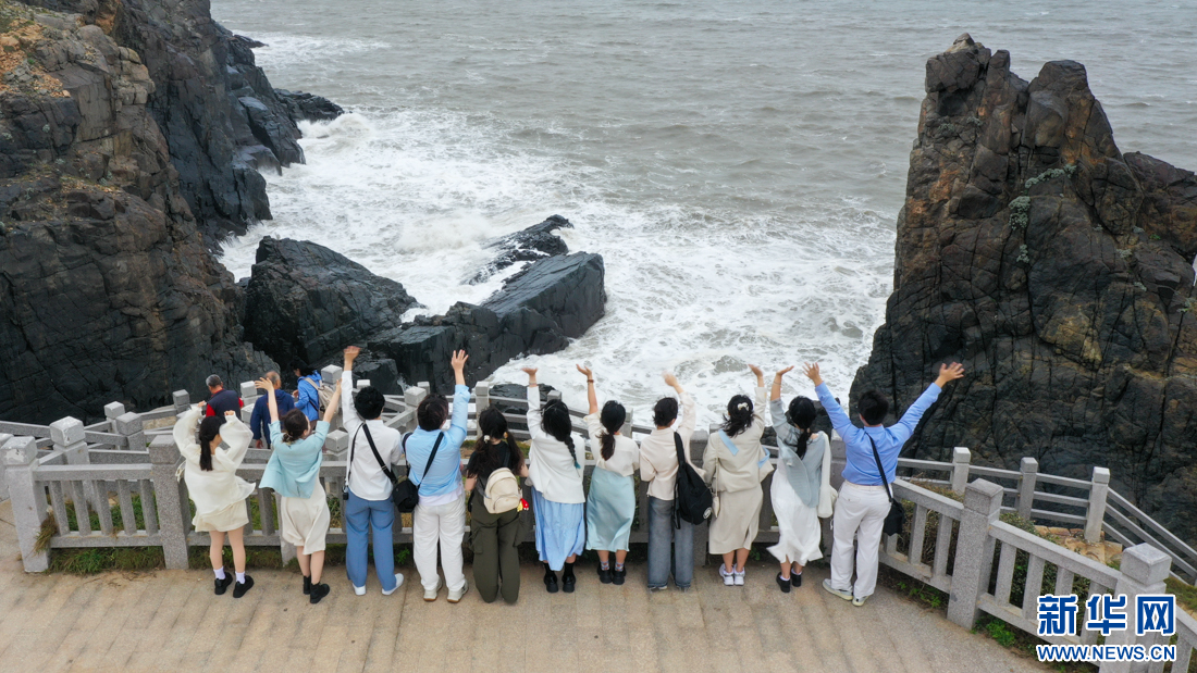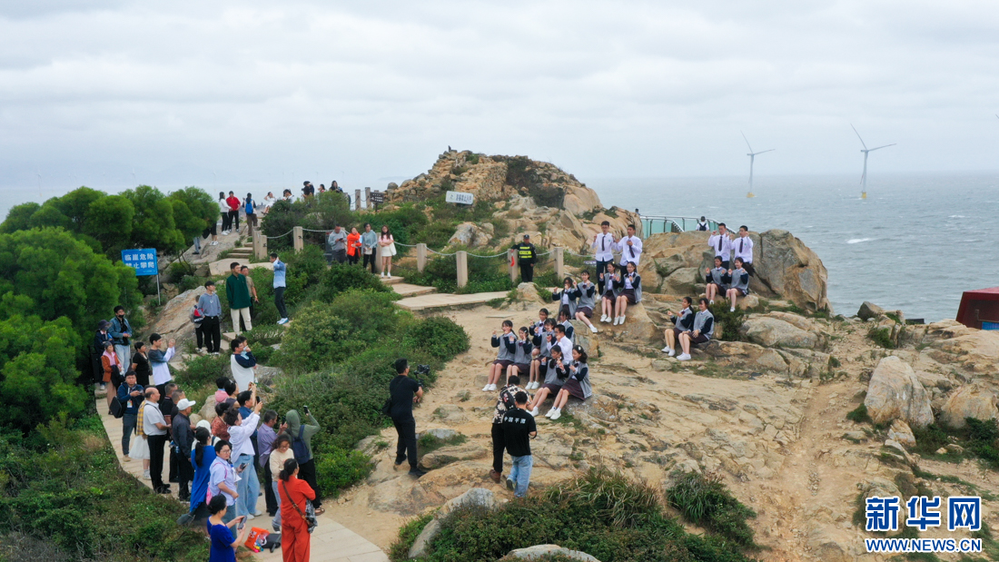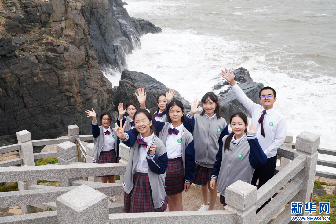 厦门六中博雅合唱团(阿卡贝拉团)学生在平潭仙人井景区打卡,感受海岛风情。新华网 肖和勇 摄