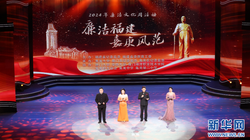 新华网福州10月21日电(刘默涵)20日晚,福建省2024年廉洁文化周活动之“廉洁福建·嘉庚风范”主题晚会在集美大学举办。晚会分为“俭廉办学”“清风明月”“不忘初心”三个篇章,以歌舞、短剧、合唱、民乐重奏等多种形式,引领现场观众穿越时空,感受嘉庚先生的家国情怀与奋斗精神。