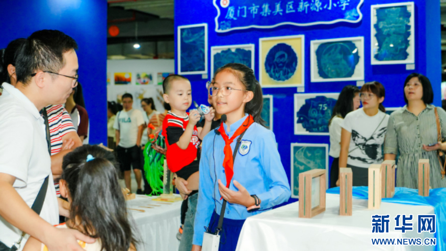10月19日,2000余件美术作品亮相厦门市集美区的“诚毅之美”中小学、幼儿园学生美术作品展,展现集美学子在“嘉庚精神”浸润下,对祖国、对文化、对生活的热爱之情。这是作品展上,一名学生在向参观市民介绍作品情况。新华网发(厦门市集美区教育局供图)