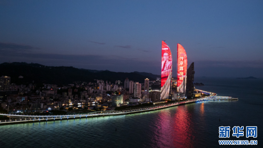 10月20日晚,厦门多栋地标性建筑陆续亮灯打出“华侨旗帜 民族光辉”等标语,形成了一幅幅壮丽的画面,让广大市民和游客直观感受到“嘉庚精神”穿越时空的魅力。这是厦门世贸双子塔的陈嘉庚先生诞辰150周年夜景灯光秀。新华网发(厦门广播电视节目有限公司供图)
