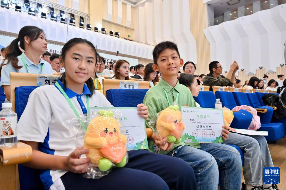 10月26日,两名获得2024年“爱鸟周”自然笔记比赛优秀奖的学生展示奖品和证书。新华社记者 姜克红 摄