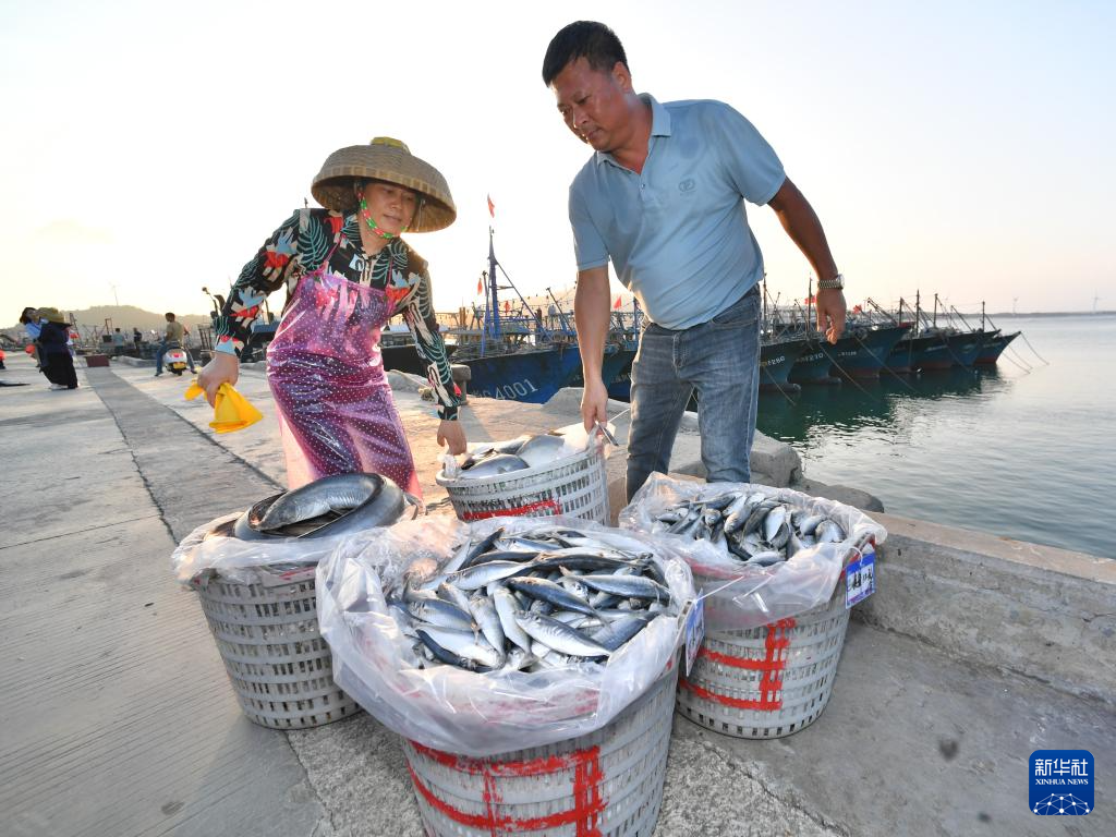 近日,澳角村村民在渔港码头上搬运海产品。新华社记者 姜克红 摄