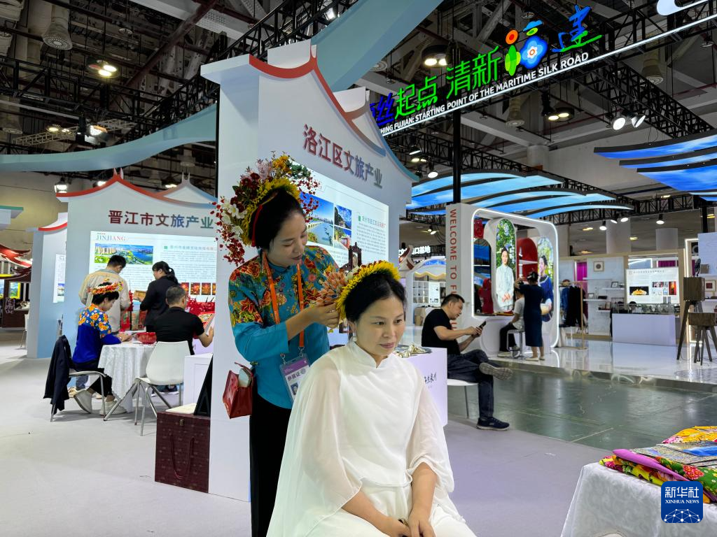 10月31日,客商在展会上体验蟳埔簪花。新华社记者 颜之宏 摄