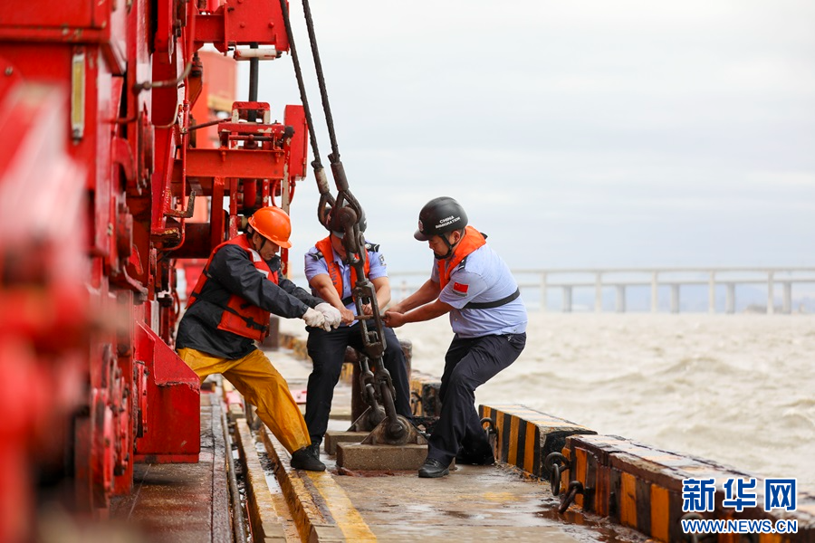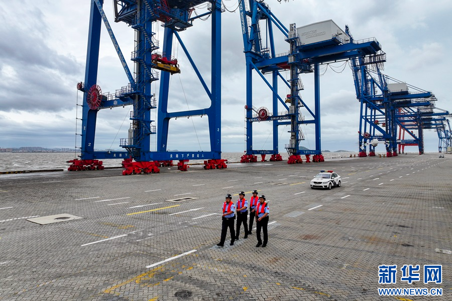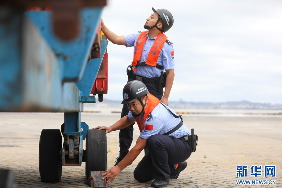 10月31日,福建省泉州市石湖口岸,泉州出入境边防检查站民警检查码头机械设备加固情况。新华网发(谢贵明 摄)