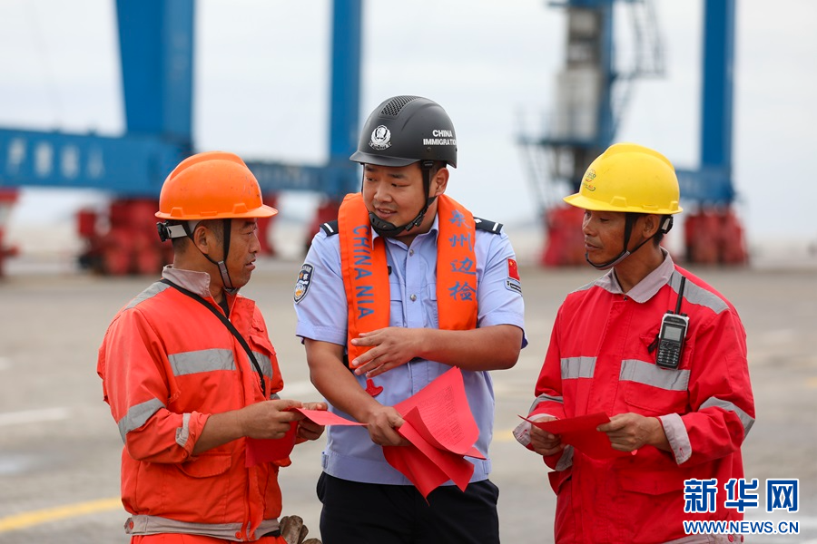 10月31日,福建省泉州市石湖口岸,泉州出入境边防检查站民警向码头工人进行防台风宣传。新华网发(谢贵明 摄)
