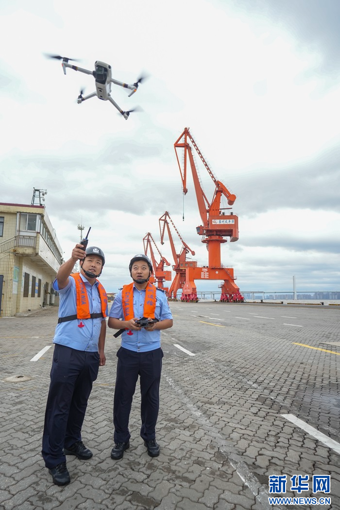 10月31日,福建省泉州市石湖口岸,泉州出入境边防检查站民警运用警用无人机进行防台风巡查。新华网发(谢贵明 摄)