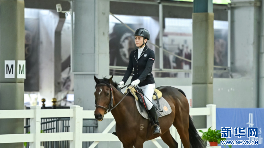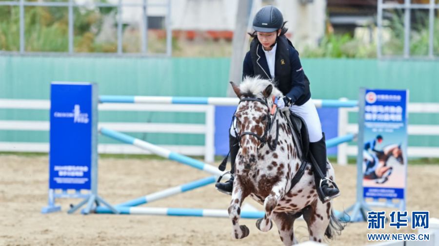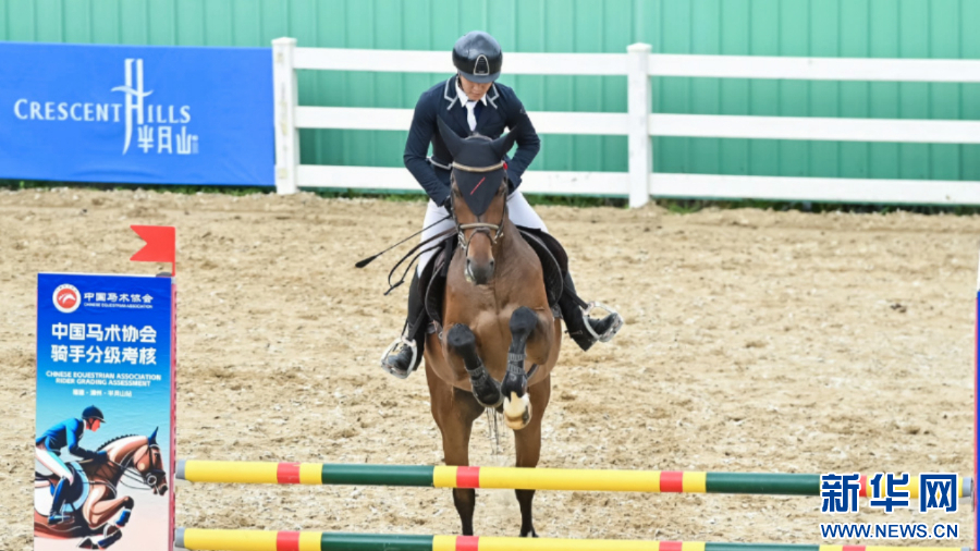 本次马术考核内容涵盖了盛装舞步和场地障碍两大类别。这是一名骑手在进行场地障碍考核。新华网发(主办方供图)