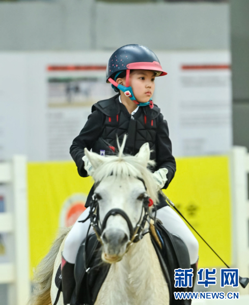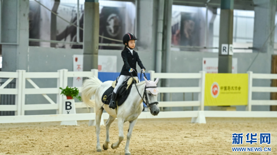 本次马术考核内容涵盖了盛装舞步和场地障碍两大类别。这是一名小骑手在马场上进行盛装舞步考核。新华网发(主办方供图)