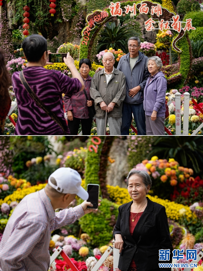 许多老人在菊花展上赏花、留影(拼版照片)。 新华网 蒋巧玲 摄