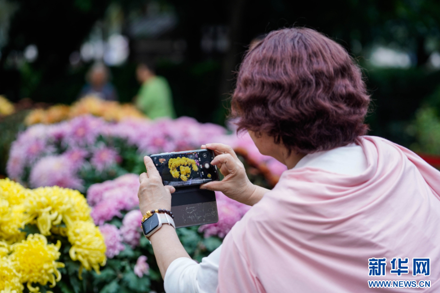 一位游客正在用手机记录盛开的菊花。 新华网 蒋巧玲 摄