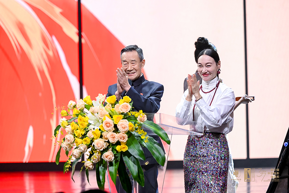 李雪健与惠英红为金鸡点冠,现场响起热烈掌声。新华网发(主办方供图)