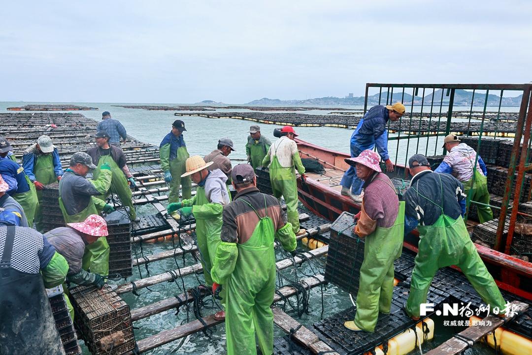连日来,苔菉中心渔港码头热闹非凡,小型渔船来回穿梭,渔民将一个个重约10公斤的鲍鱼养殖箱从活水运输船上拖拽上船,驶向附近的养殖区进行挂笼立体放养,鲍鱼们将在这里继续下一阶段的生长。